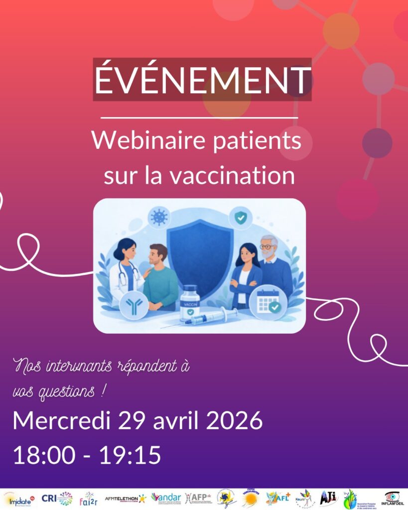 Dans le cadre de la Semaine Européenne de la Vaccination 2026, le CRI-IMIDIATE, la Filière FAI²R et les associations de patients partenaires vous donnent rendez-vous pour un webinaire dédié aux patients atteints de rhumatismes inflammatoires, de maladies auto-immunes et auto-inflammatoires rares.